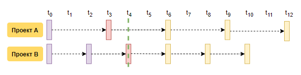 На первом этапе проект A обгоняет проект B. Проект A пропустит свой