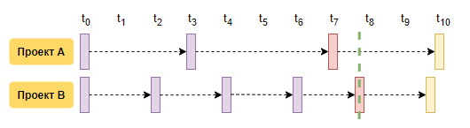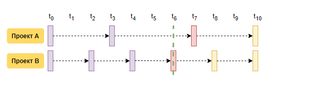 на заданный шаг синхронизации t8, проект B достигает времени t8-Δt.