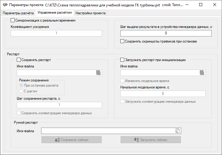 Перед запуском расчета требуется привести в соответствии с Рис. 13 Параметры расчёта для схемы автоматики, а также снять галочку во вкладке Управление расчётом в графе Синхронизация с реальным временем.