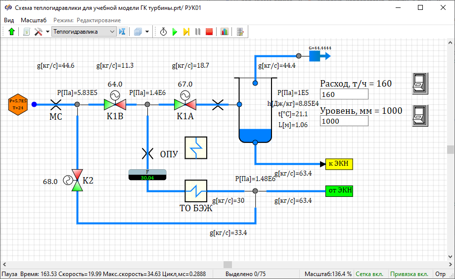 Чтобы проверить работоспособность схемы и правильность выполнения всех предыдущих действий, давайте зададим (примерно) стационарные значения положения клапанов для расхода подпитки, равного 160 тонн в час. Для сохранения всех параметров схемы более или менее постоянными (стационарными) при таком расходе, следует выставить следующие положения клапанов: 46% для К2, 43% для К1В и 45% для К1А.