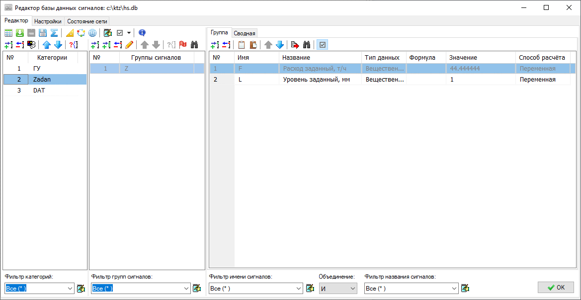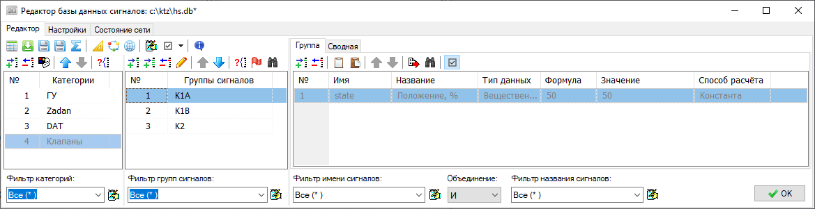 Для записи сигнала "Положение клапана К1А" в базу данных, нам сначала следует создать объект (группу сигналов) К1А в базе данных. Если вы еще не создали категорию Клапаны, создайте её, и затем добавьте в базу данных один объект такого типа с названием "К1А" или сразу все (три) задвижки. Если редактирование базы данных проходило из окна теплогидравлики (автоматики) необходимо сохранить базу данных (вкладка настройки), а затем зайти в базу данных через схему автоматики (теплогидравлики) и загрузить базу данных (вкладка настройки).