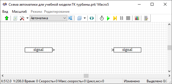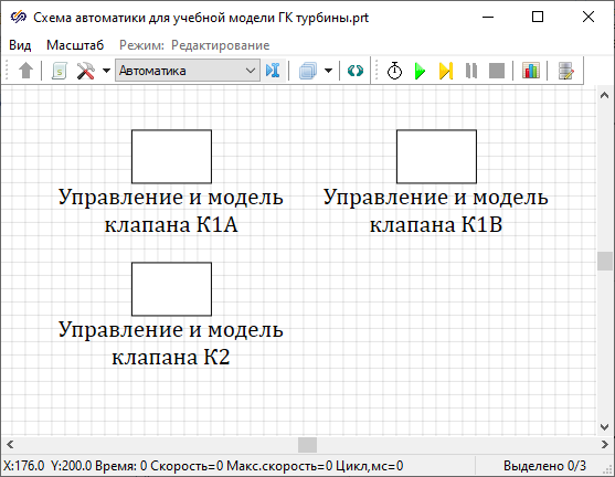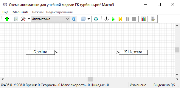 В данный момент у нас набрана гидравлическая модель системы поддержания уровня в ГК турбины. Поскольку модели автоматики еще нет, то при расчете одной лишь схемы теплогидравлики все задвижки (клапаны) будут находиться без движения, то есть точно в том положении, которое задано как начальное.