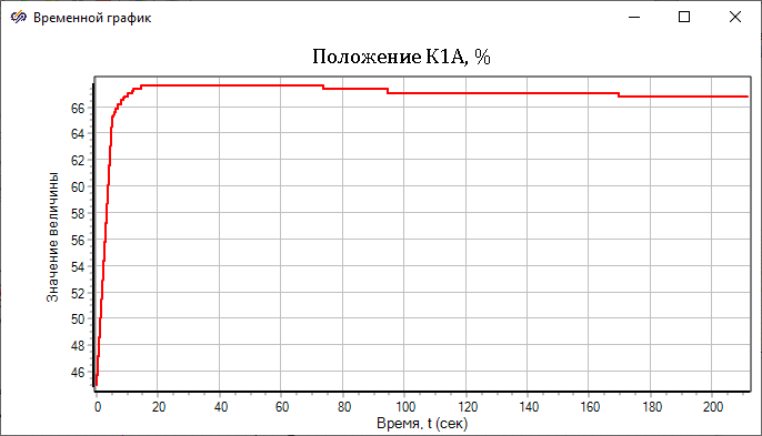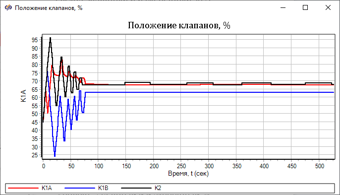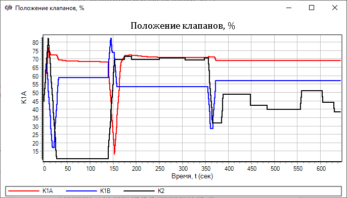 При запуске пакета проектов на расчет, в процессе расчета можно увидеть, что клапан "К1А" уже не находится в стационарном начальном положении "45%", а управляется схемой автоматики и движется в сторону открытия или закрытия.