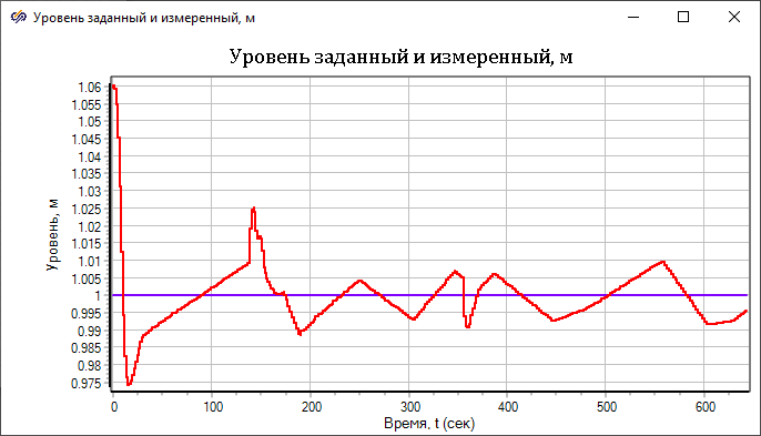 Как видно из этих рисунков, созданная нами система управления неплохо поддерживает уровень в конденсаторе в заданных пределах. Имеют место небольшие колебания клапанов в начале моделирования. Такой относительно хороший результат был достигнут за счет верно выставленных начальных положений клапанов, а также настроек регуляторов. В результате имеем колебания уровня с амплитудой не более 0.01 м.