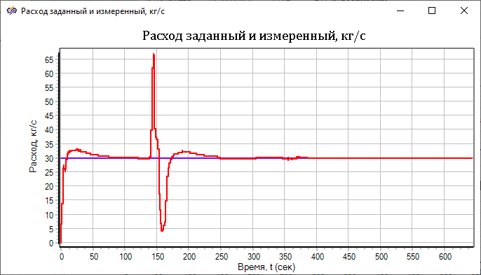Из-за скачков клапана происходит и резкое изменение расхода через ТО БЭЖ, и, как следствие, клапан К1А пытается также "подстроиться" для того чтобы через ТО БЭЖ обеспечить заданный расход в 30 кг/с.