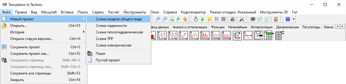 - В главном окне SimInTech выбрать пункт Файл подпункт Новый проект