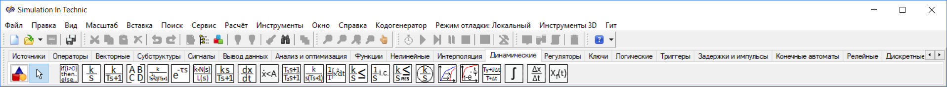 - В главном окне SimInTech в палитре блоков выбрать вкладку Динамические