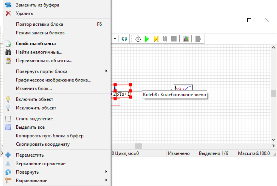 - Одинарным нажатием левой кнопкой мыши выделить блок Колебательное звено,