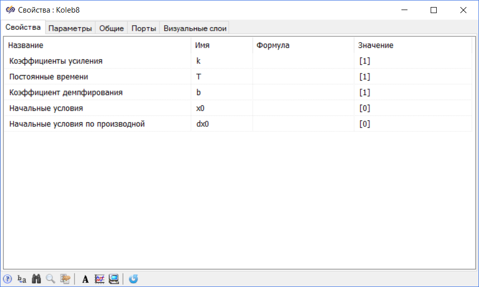Рис. 11. Окно "Свойства" блока "Колебательное звено" со свойствами по умолчанию. - Для изменения свойств блока в поле "Формула" необходимо задать новые значения