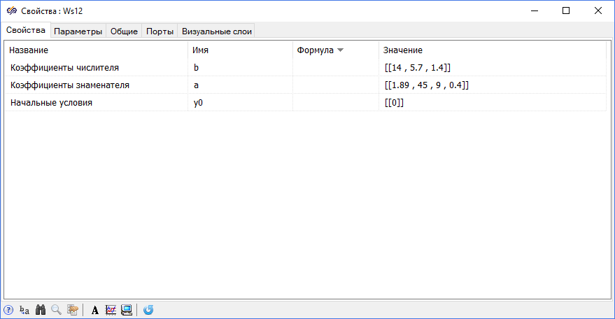 Коэффициенты числителя и знаменателя передаточной функции следует задавать в свойствах блока Передаточная функция общего вида в виде массивов соответствующих значений. Коэффициенты необходимо записывать в массив в порядке возрастания их индексов. Пример ввода коэффициентов для передаточной функции общего вида: