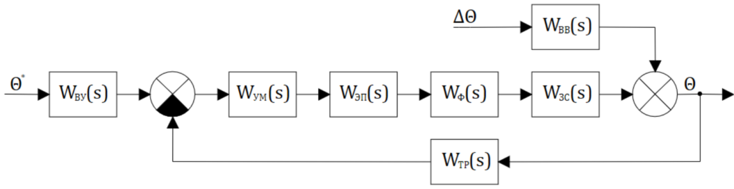 В данной работе рассматривается система автоматического регулирования температуры воздуха в зерносушилке. САР должна поддерживать значение регулируемой величины Θ (текущей температуры воздуха в зерносушилке) равным значению управляющего воздействия Θ* (требуемой температуры воздуха в зерносушилке) и компенсировать влияние возмущающего воздействия. Возмущающим воздействием является значение разности температур воздуха в зерносушилке и во внешней среде ΔΘ (моделируется теплообмен с внешней средой).