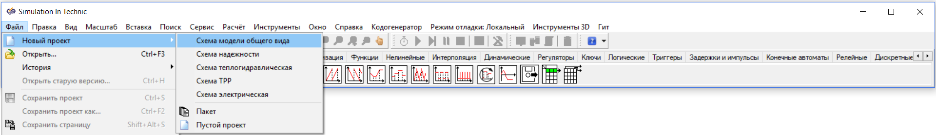 - В главном окне SimInTech нажать кнопку Файл и выбрать пункт Новый проект
