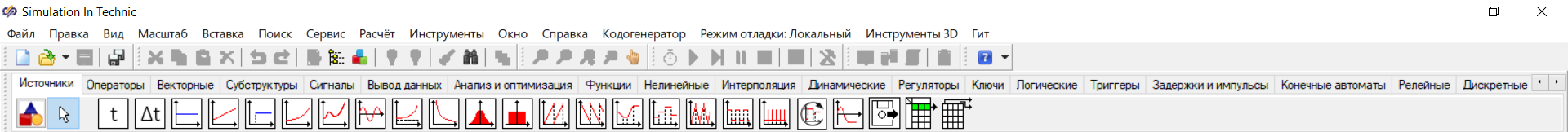 - В главном окне SimInTech в палитре блоков выбрать вкладку Источники