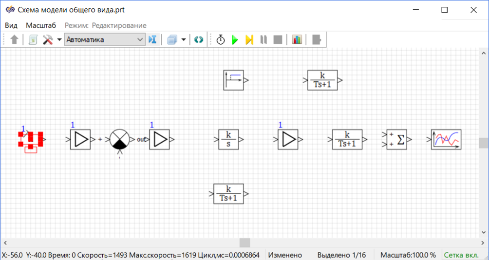 - 1 блок Интегратор и 3 блока Инерционное звено 1-го порядка из вкладки Динамические - с помощью данных блоков будут моделироваться элементы САР