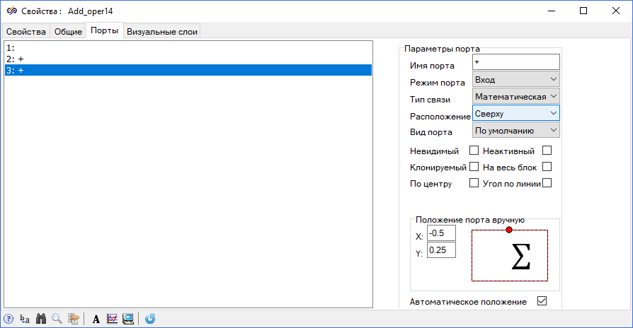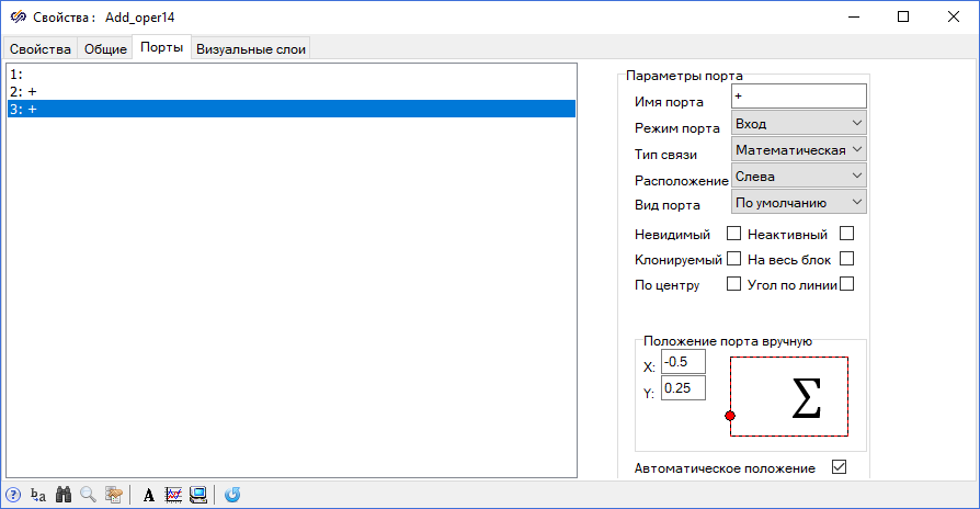 Рис. 11. Вкладка "Порты" окна "Свойства". - В списке портов блока выбрать порт "3: +" и в поле "Расположение"
