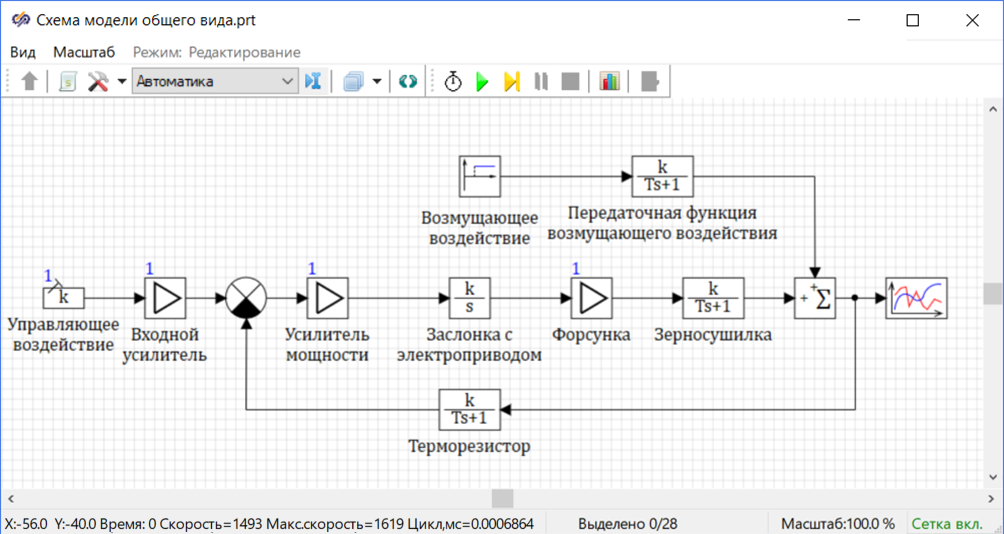 - WВВ(s) = 0.3/(200s +1)− передаточная функция возмущающего воздействия, описывающая процесс теплообмена зерносушилки с внешней средой.