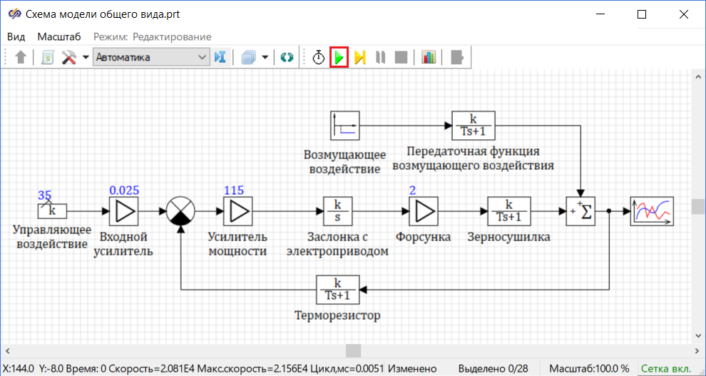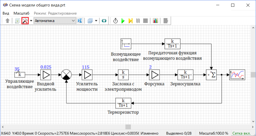 Необходимо задать свойства элементов САР в соответствии с описанными выше передаточными функциями, для этого требуется задать новые значения свойств ряда блоков на схеме: