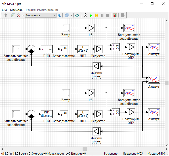 Для этого в окне проекта выделить все блоки и их связи, используя команду Выделить все из меню Правка. С помощью команд Копировать и Вставить меню Правка или одноименных кнопок или сочетаний клавиш "Ctrl+C" и "Ctrl+V" создать копию ранее созданной структурной схемы, расположив ее в нижней части окна проекта. В нижней схеме удалить блоки ПИД и звено запаздывания вместе с их связями. На их место установить блок Дискретный ПИД-регулятор из вкладки Дискретные.