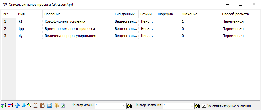 Список сигналов проекта позволяет создать список переменных, которые используются в процессе моделирования и обеспечивают доступ к данным переменным по их имени.