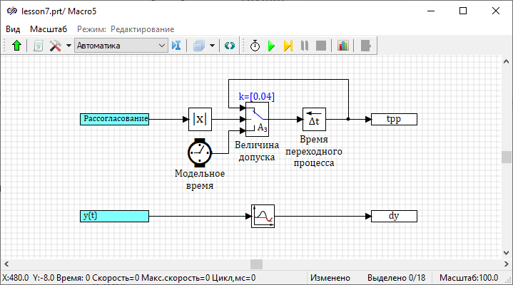 - Задержку на шаг интегрирования осуществляет блок с подписью "Время переходного процесса" (блок Задержка на шаг интегрирования из вкладки Нелинейные)