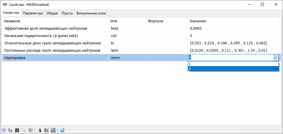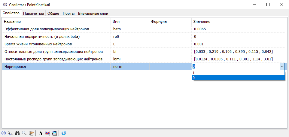 На рисунке представлено окно свойств этого блока (Рис. 2), где умолчанию β*i и λi соответствуют данным для топлива 235U, а значения свойства "Нормировка" имеют тот же смысл, что и в окне свойств блока Точечная кинетика.
