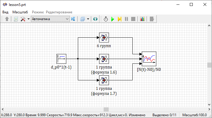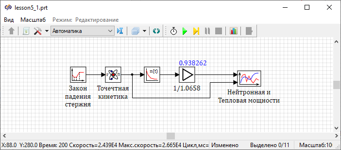 end;В свойствах блока Точечная кинетика в поле "Формула" свойства "Эффективная доля запаздывающих нейронов" задать значение "beff". В свойствах блока с подписью "1/β_эфф" в поле "Формула" свойства "Коэффициент усиления" задать значение "1/beff". В субмодели с подписью "Привод СУЗ" в блоке Синусоидальная функция задать свойства "Амплитуда, в формуле a*sin(w*x(t)+f)" равным "pmax".