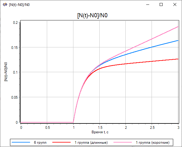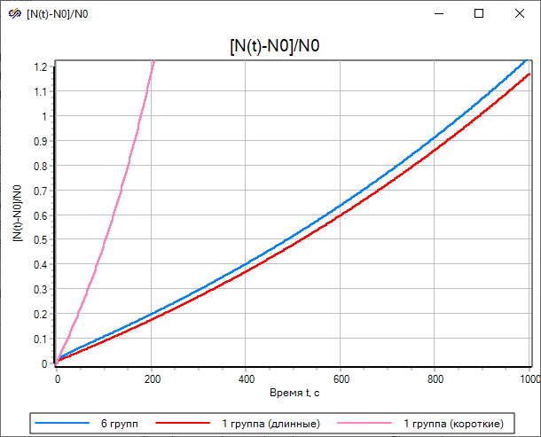 Результат расчета показывает, что с эффективной постоянной распада "Lam" одногрупповая модель кинетики лишь приблизительно соответствует классической модели кинетики, а с эффективной постоянной распада "Lam_1" – различие огромно (при t = 1000c приблизительно в 40 раз).