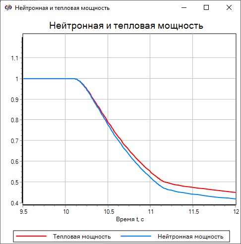 - при 0 с ≤ t ≤ 105 c относительная нейтронная мощность реактора (нормированная на номинальную нейтронную мощность) равнялась 0.5