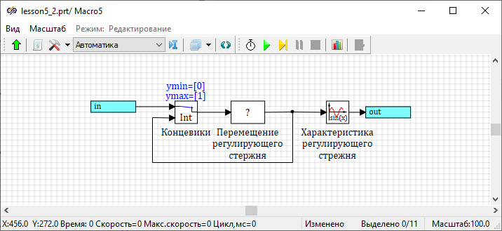 - блок с подписью "Перемещение регулирующего стержня" моделирует перемещение регулирующего стержня