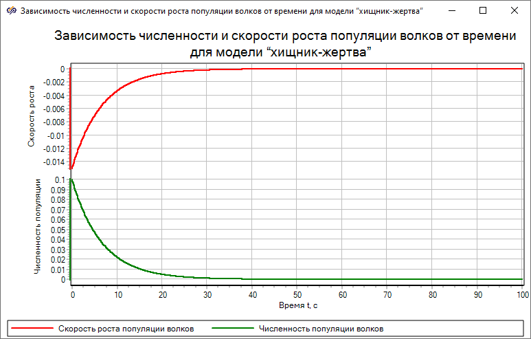 Из результатов расчета следует вывод: численность волков экспоненциально убывает при отсутствии взаимодействия с популяцией зайцев.