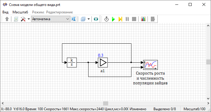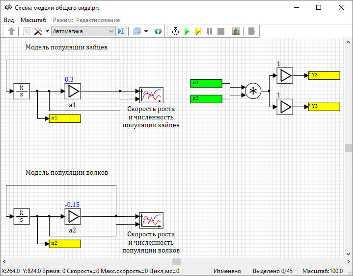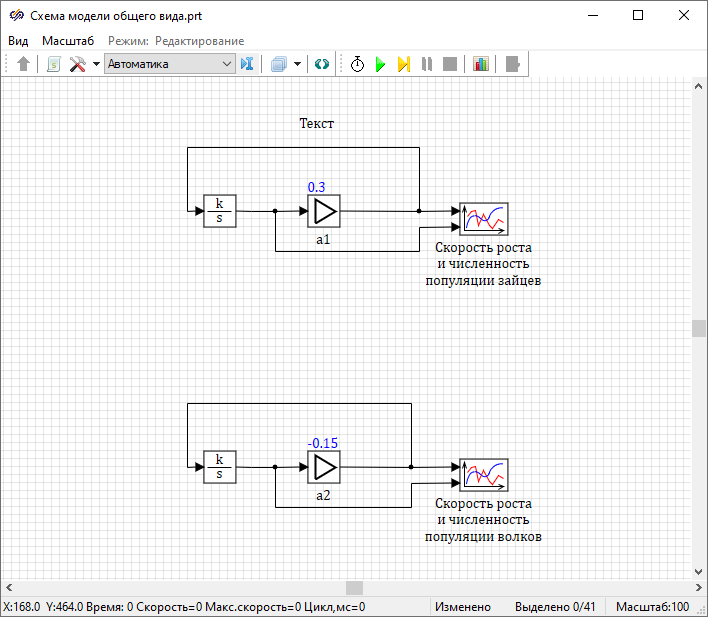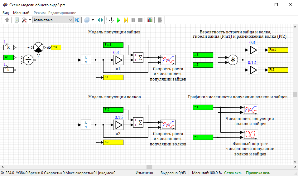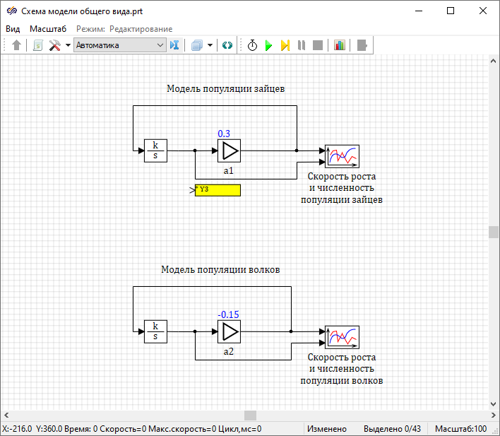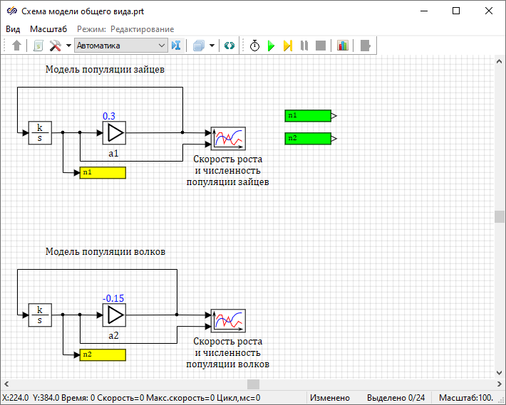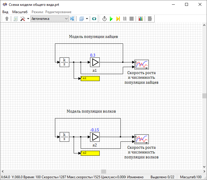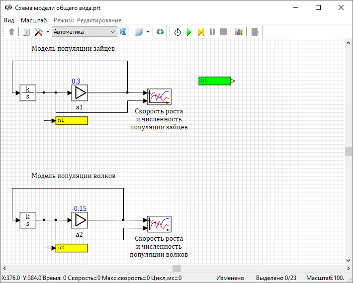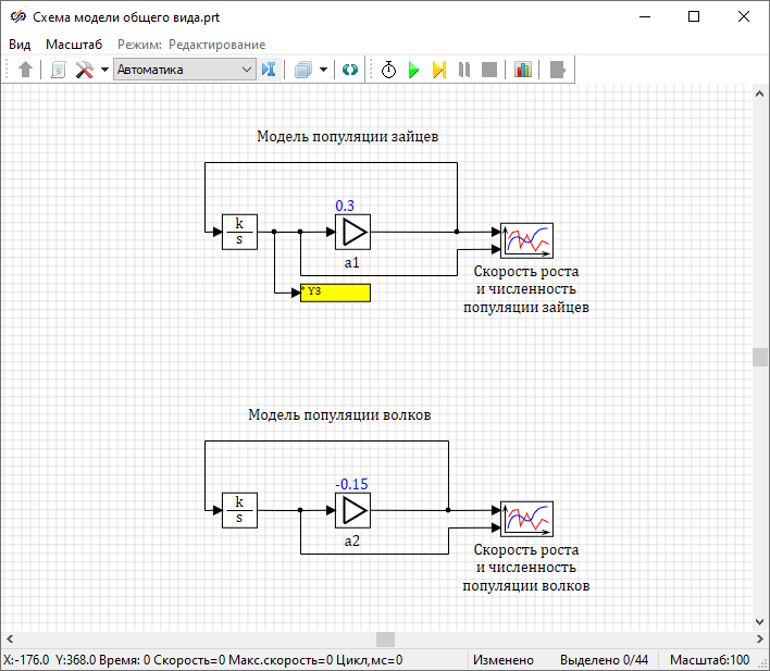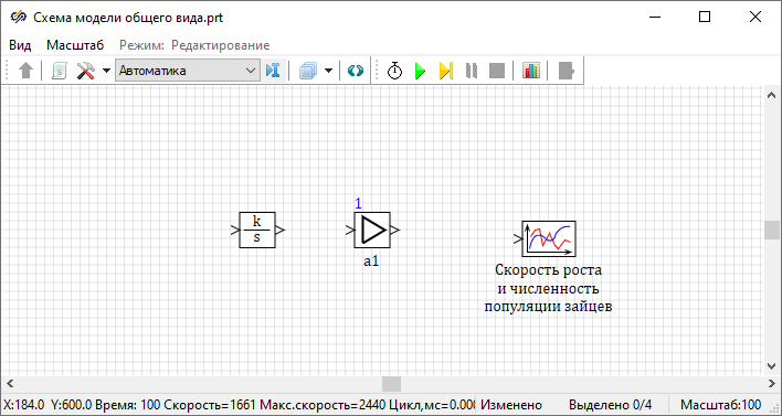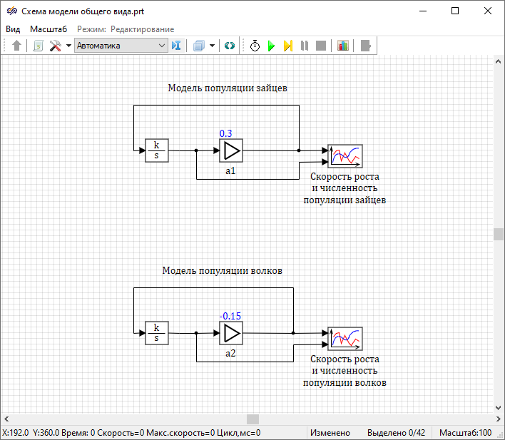 - Скопировать схему экспоненциального роста популяции зайцев и вставить ее на свободное место в рабочем поле окна проекта