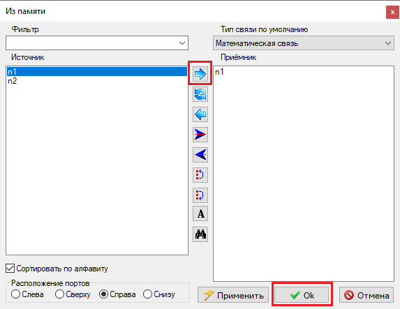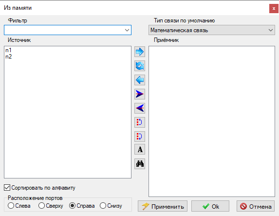 Рис. 28. Окно редактирования блока "Из памяти". - Одинарным нажатием левой кнопкой мыши выделить имя сигнала "n1" в столбце "Источник"