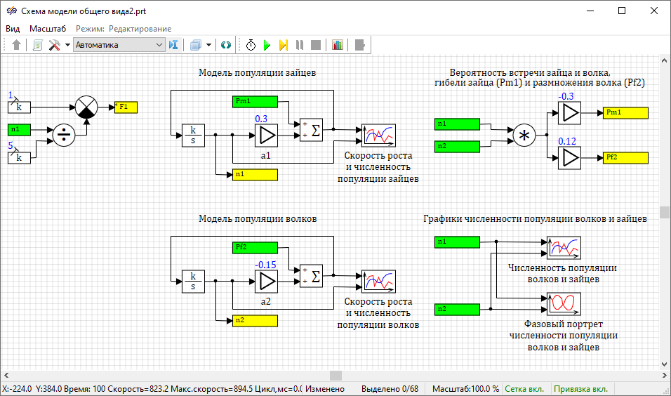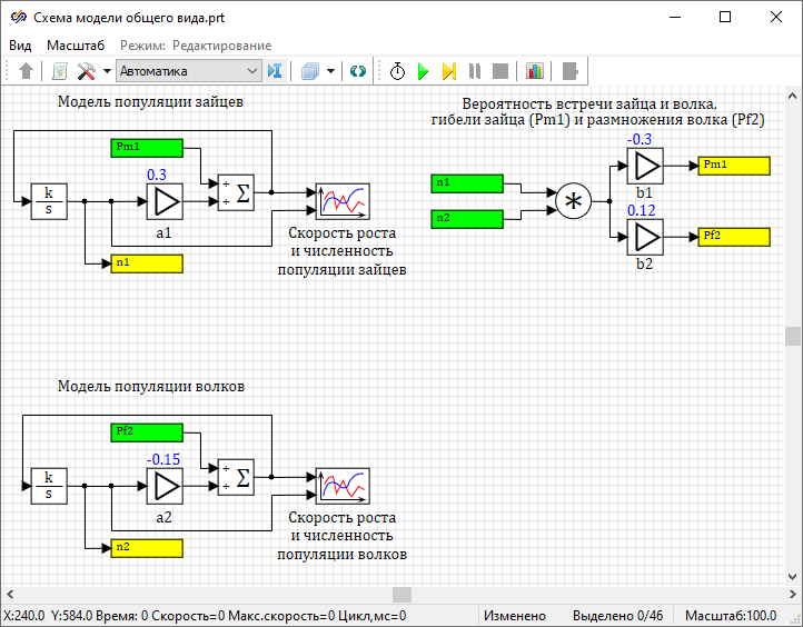 собранной структуре. Итоговая схема модели "хищник-жертва" на основе