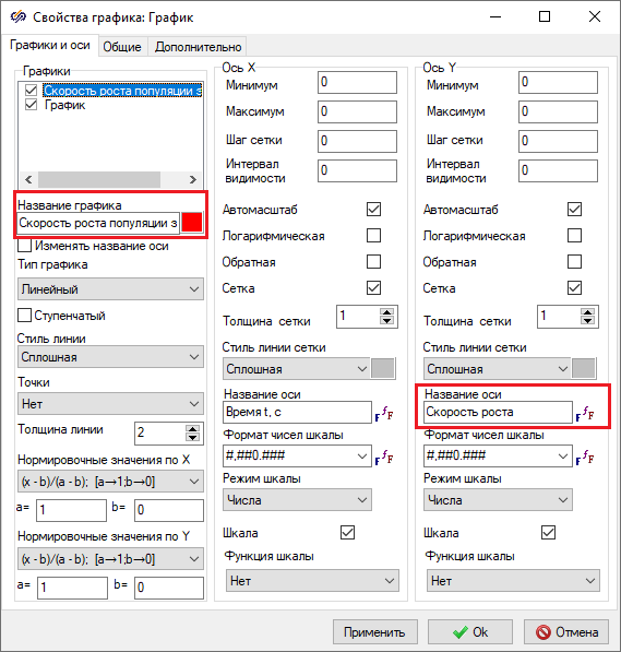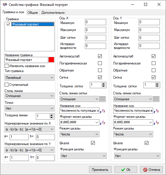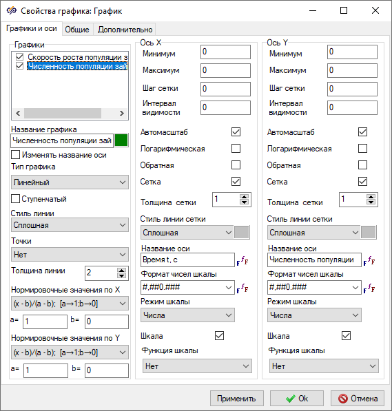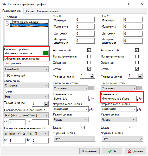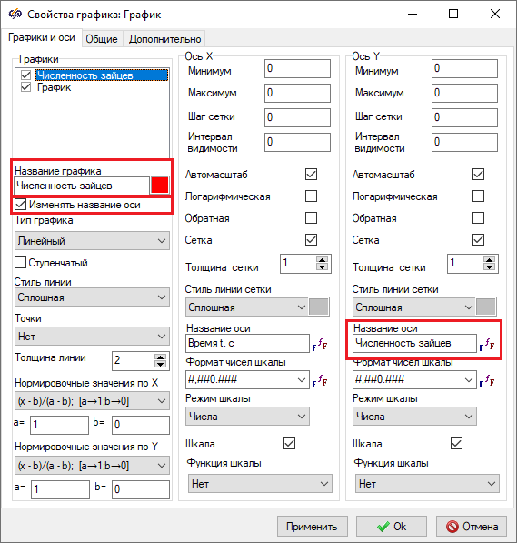 Рис. 7. Вкладка "Графики и оси" графика численности популяции зайцев.