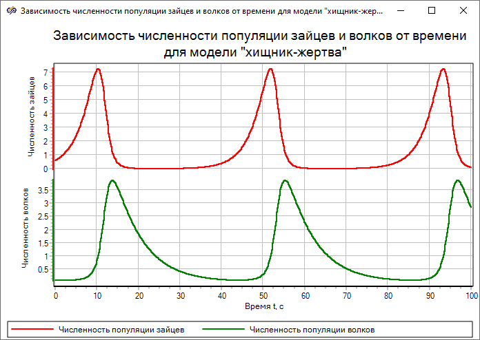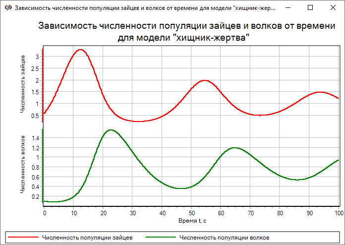Из результатов расчета следует вывод: модель взаимодействия популяций "хищник-жертва" на основе моделей ограниченного роста демонстрирует периодическое решение, однако с течением времени численность популяции хищника и жертвы уменьшается и сводится к определенной точке, где достигается взаимное равновесие между хищниками и жертвами.