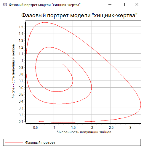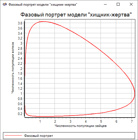 - При данном наборе параметров численность популяций жертвы и хищника доходят до минимальных значений, но остаются положительными. При этом условии процесс приобретает циклический (волновой) характер. В случае, если численность популяции жертвы станет равна нулю, численность популяции волков также уменьшится до нуля