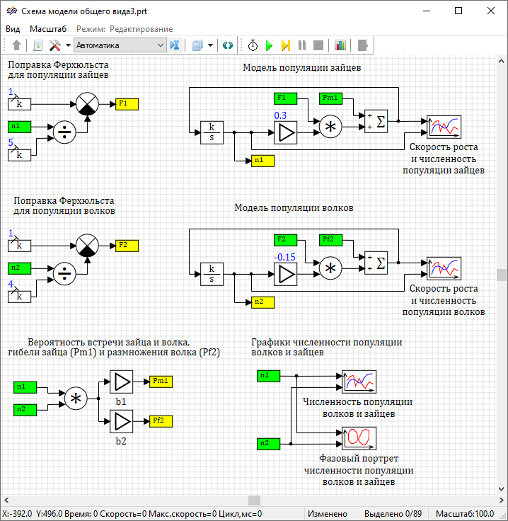 Рис. 44. Схема проекта с поправкой Ферхюльста для популяции зайцев.