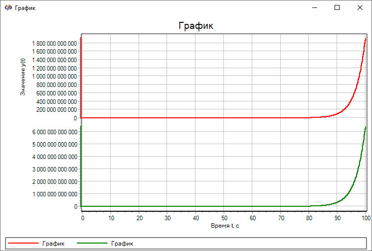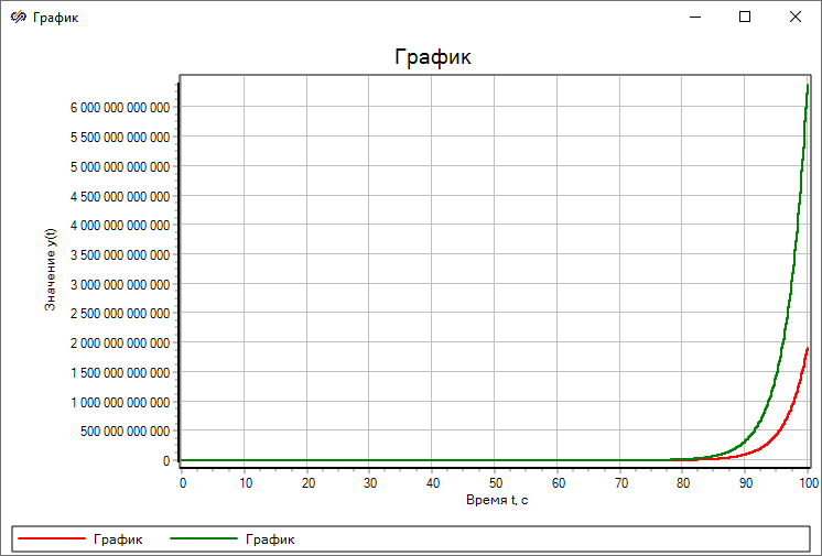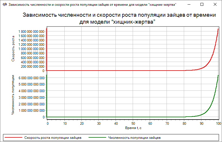 Из результатов расчета следует вывод: численность зайцев экспоненциально возрастает при отсутствии взаимодействия с популяцией волков.