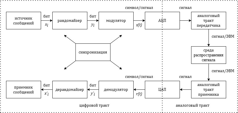 Последующий набор блоков служит входным интерфейсом к среде распространения сигнала и включает аналогово-цифровой преобразователь (АЦП), а также аналоговый передатчик. Искажения и шумы накладываются на передаваемый сигнал в среде распространения, в качестве которой на практике может выступать свободное пространство или некоторая проводная линия связи. На приемной стороне согласование физической среды и аппаратуры происходит в первую очередь в блоках аналогового приемника и цифро-аналогового преобразователя. Аналоговый тракт совместно со средой распространения сигналов называются каналом связи.