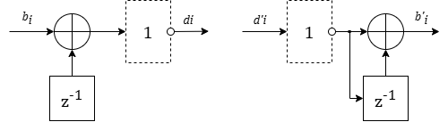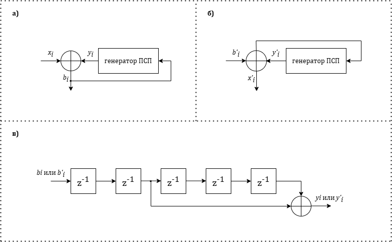Для восстановления передаваемой информации на приемной стороне принятая битовая последовательность умножается на скремблирующий полином, что соответствует нерекурсивному фильтру с вычислениями по модулю два (Рисунок 5 (б)).