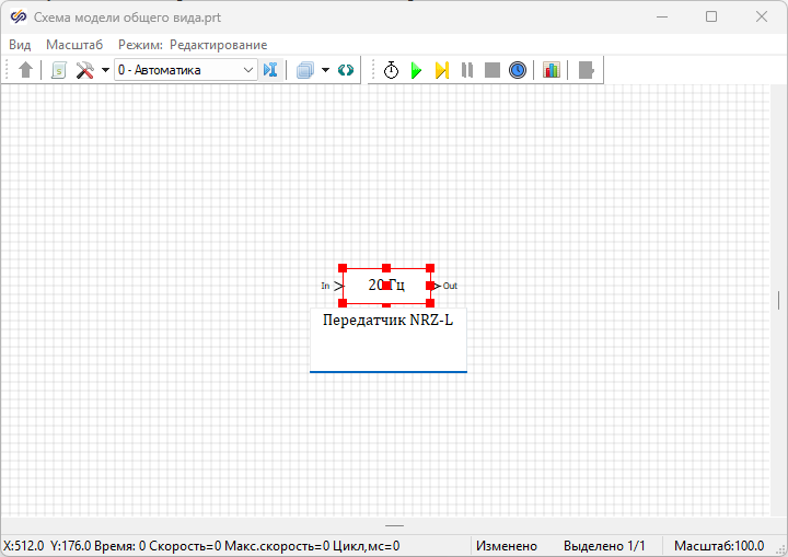- 1 блок Перемножитель из вкладки Операторы. Данный блок необходим для перемножения сигналов, поступающих из блоков "Передатчик NRZ-L" и Меандр
