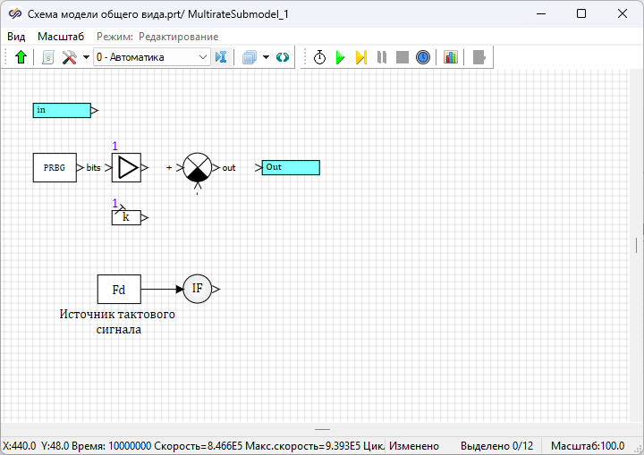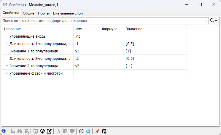- 1 блок Меандр из вкладки Источники. Данный блок необходим для формирования сигнала