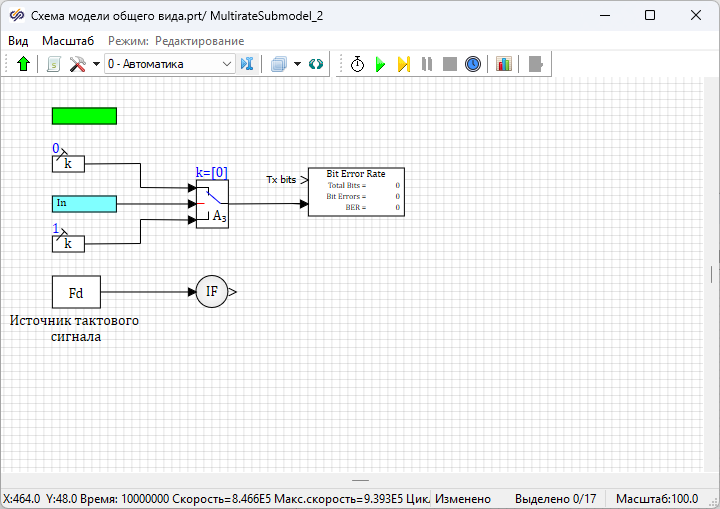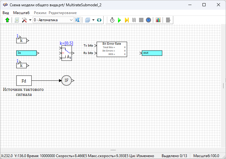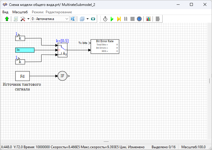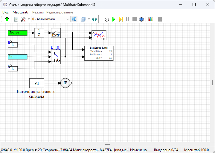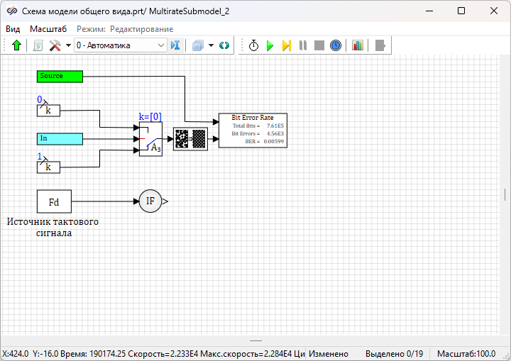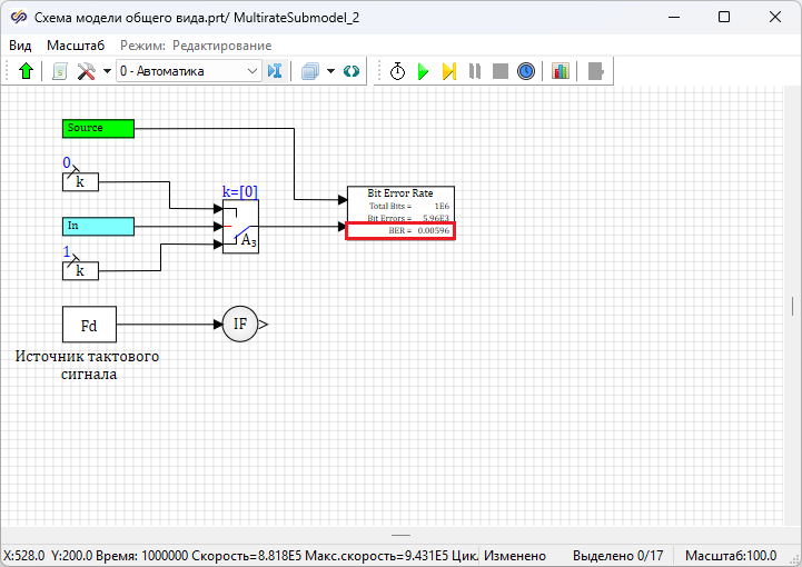 Далее необходимо запустить проект на расчет нажатием на кнопку Пуск. После окончания моделирования войти в субмодель блока Субмодель с поддержкой МОС с подписью "Приемник NRZ-L МК". Величина "BER" в блоке Расчет BER равна "0.5", что не соответствует теоретическим ожиданиям для данного вида модуляции.