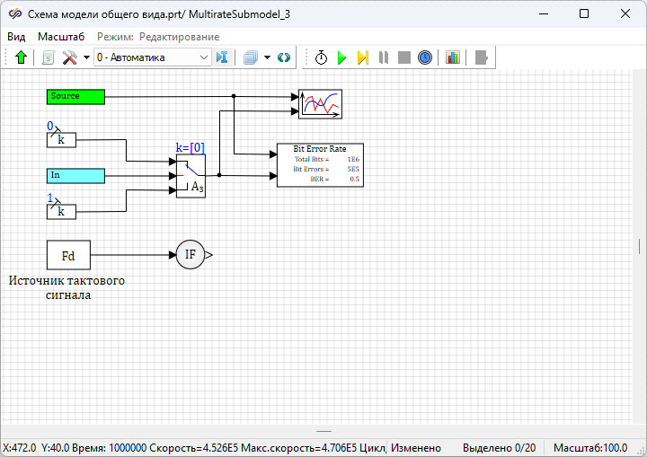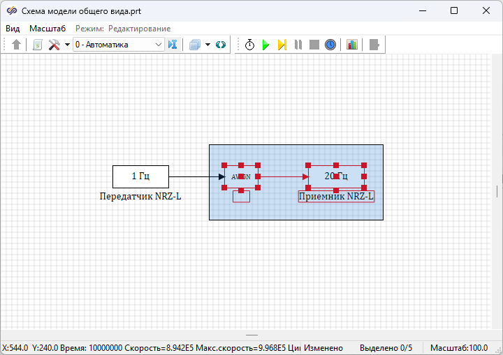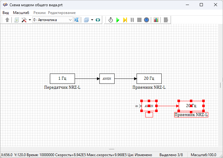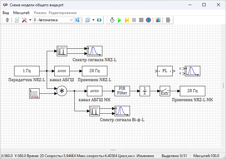 В окне Параметры проекта следует изменить значение свойства "Конечное время расчета" на "1e+6" и еще раз запустить проект на расчет. Значения "BER" в блоках Расчет BER для блоков с подписями "Приемник NRZ-L" и "Приемник NRZ-L МК" должны примерно совпадать.