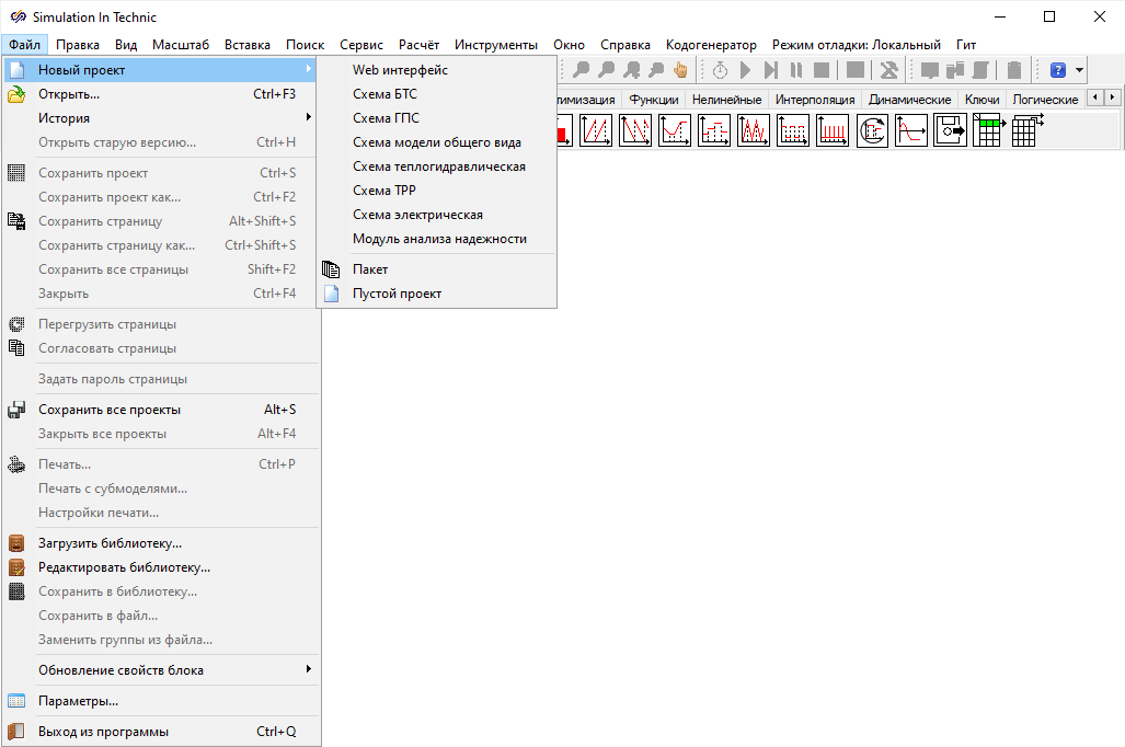 - В главном окне SimInTech выбрать пункт Файл, подпункт Новый проект