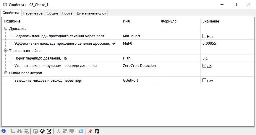 - "Эффективная площадь проходного сечения дросселя, м²" − "0.00055"
