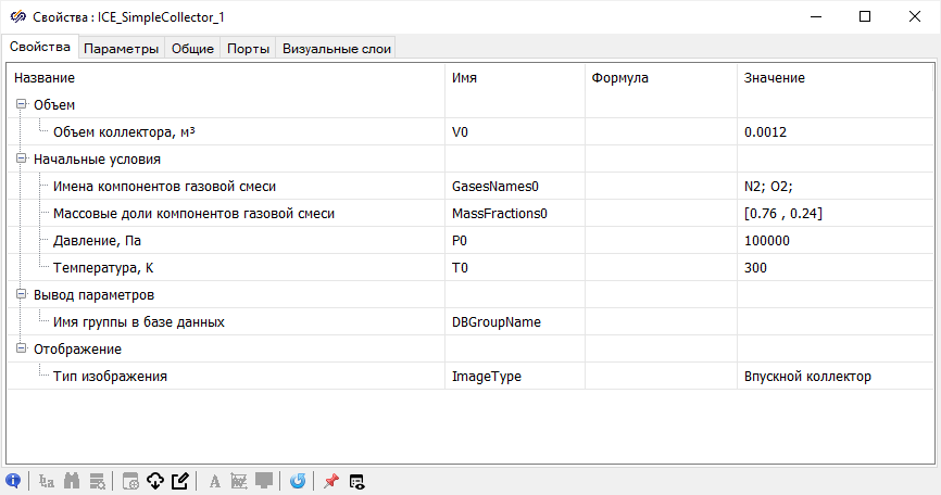 Рис. 16. Окно "Свойства" блока "Простой коллектор" с подписью "Впуск".