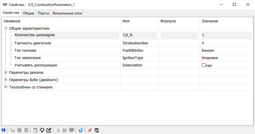 - 1 блок Характеристики сгорания из подменю Характеристики двигателя − позволяет задавать параметры процесса сгорания и теплообмена рабочего тела со стенками камеры сгорания