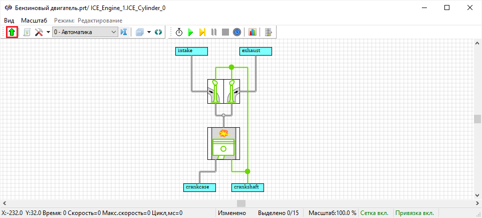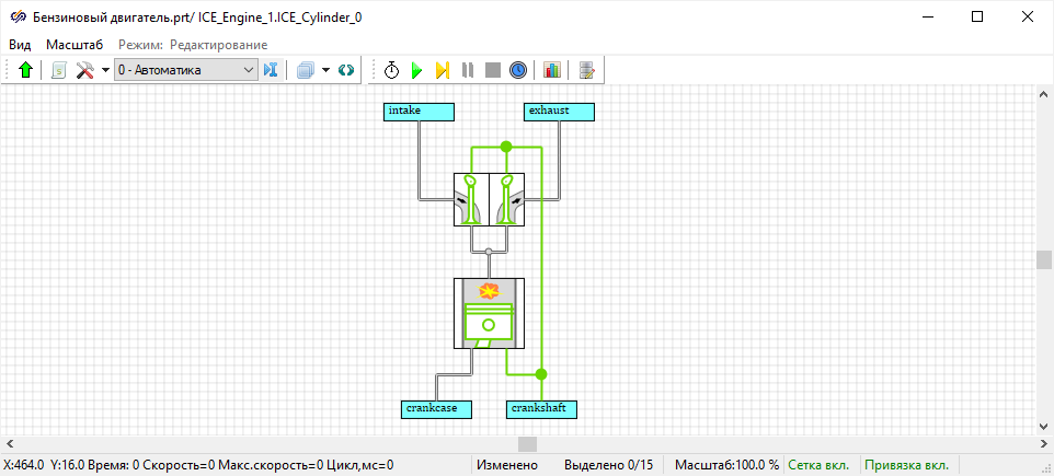 - 1 блок Цилиндр из подменю Механическая система − является субмоделью и содержит внутри себя впускной и выпускной клапаны и камеру сгорания. Блок необходим для моделирования процессов, протекающих в одном цилиндре