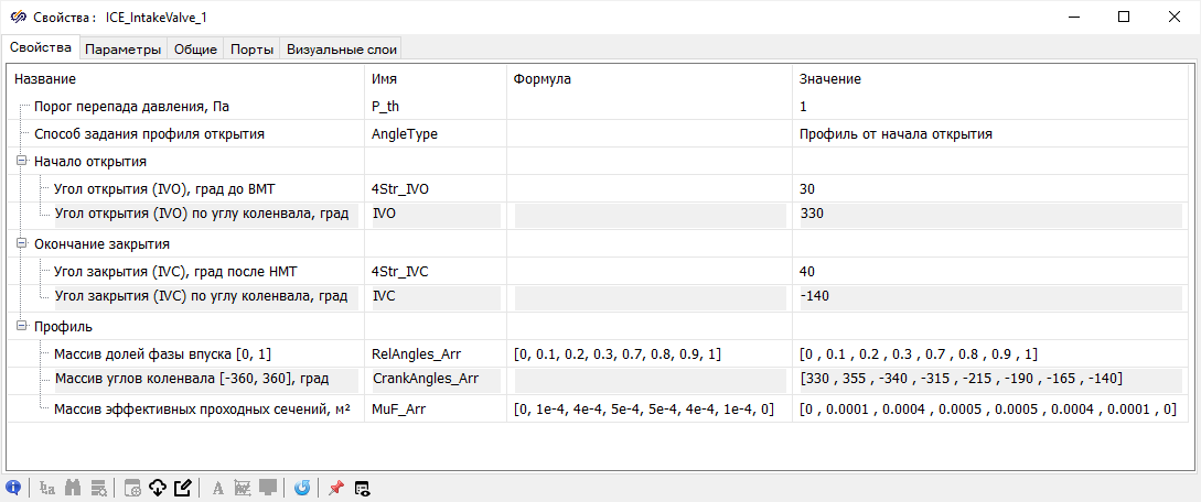 - "Способ задания профиля" − "Профиль от начала открытия" − откроется список свойств для задания профиля открытия клапанов